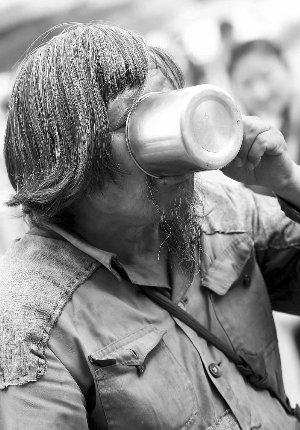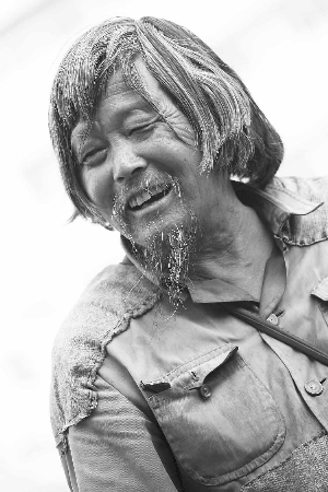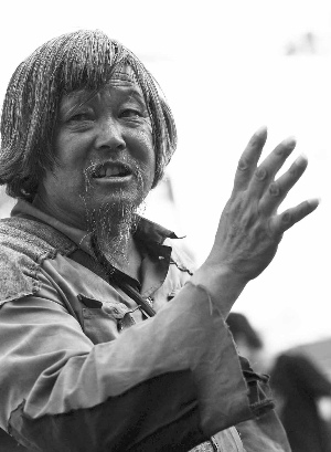 花白的头发,古铜色的皮肤,蓝色的上衣上布满了补丁,袖子和衣服的下摆已经撕烂,穿着一双塑料拖鞋,走起路来有点瘸。老人正想找块地坐下休息,得知记者来意后,老人摆了摆手,“你们不要采访我,大家都是为了灾区人民,我不比谁伟大多少!”