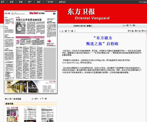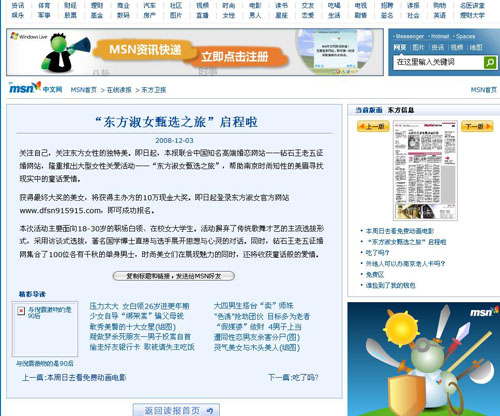 2008年12月12日“东方淑女甄选之旅”网络报道--MSN首页东方卫报