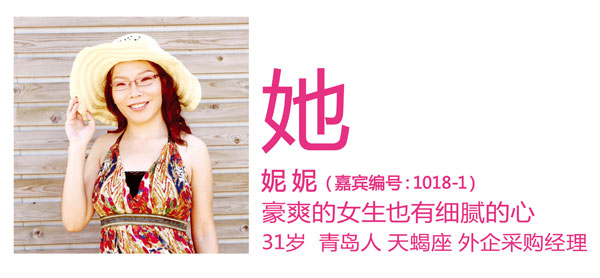 妮妮是山东人,因此有着北方女孩特有的那种豪爽、大气。拍摄过程中,她始终没有什么忸怩,大大方方对待包括男嘉宾在内的每个人。在生活中,她也 是朋友眼里的“豪爽女”,遇到朋友有事找她,她都会像一把火一样地热情对待,让很多人觉得特别温暖。举个小小的例子,在婚介所化妆时,妮妮看到那里提供的 一次性水杯,是塑料的那种,她马上说:“明天我买一些我们公司的一次性水杯送过来,我们公司的那种水杯是专门出口的,质量特别好,非常耐用。”一个小小细 节,我们可以看出,这真的是个粗中有细的女孩,既有北方女孩的爽气,也有南方女孩的细心。果然,妮妮自己也说,她不是那种娇滴滴的小女人,和人相处,她会 站在对方的角度考虑事情。一个懂事、成熟的女孩,工作也不错,目前她负责给以色列公司进行国内采购,工作上独当一面,让她变得格外独立、干练。正因为这几 年工作一帆风顺,所以才能在上海这样的大城市牢牢扎下根,并且也把父母从家乡接了过来。一个优秀的女孩,正在等待懂得欣赏她的人,你会是那个人吗?