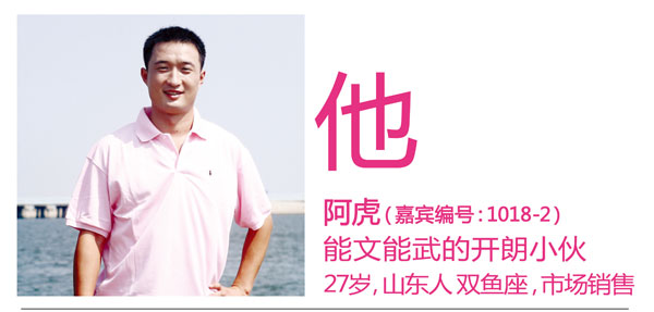 阿虎是个脾气很好的山东小伙子。拍摄中,编辑和摄影都常常和他开玩笑,他都笑呵呵地应承着。休息间隙,他还一直和女嘉宾攀谈着,虽然两人不来电,但是他依然很绅士地照顾着女孩。